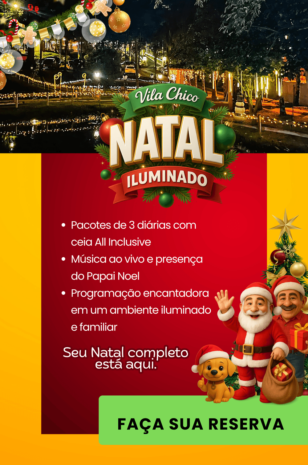 A nossa história começou com o Pesqueiro do Chico, que se tornou um grande sucesso em São Lourenço. A ideia de expandir foi abraçada, surgindo assim o Restaurante do Chico no ano de 2001. Após dez anos de sucesso e tradição, decidimos ampliar ainda mais a Vila, contando agora com Hospedagens em Chalés e Suítes!